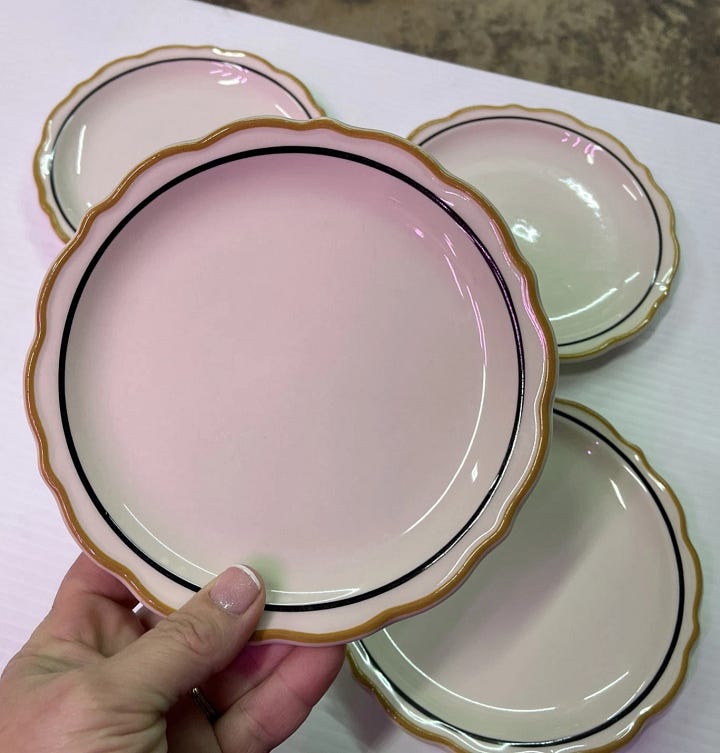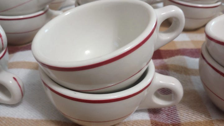 If you’re interested in this exact set, here’s the link. But this discovery sent me down a deep dive into vintage restaurant ware, because this simple striped situation has been around for a while.