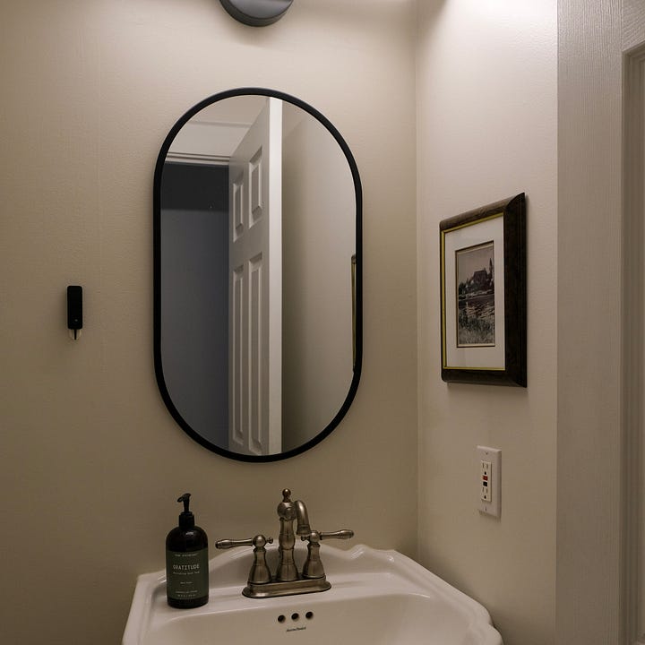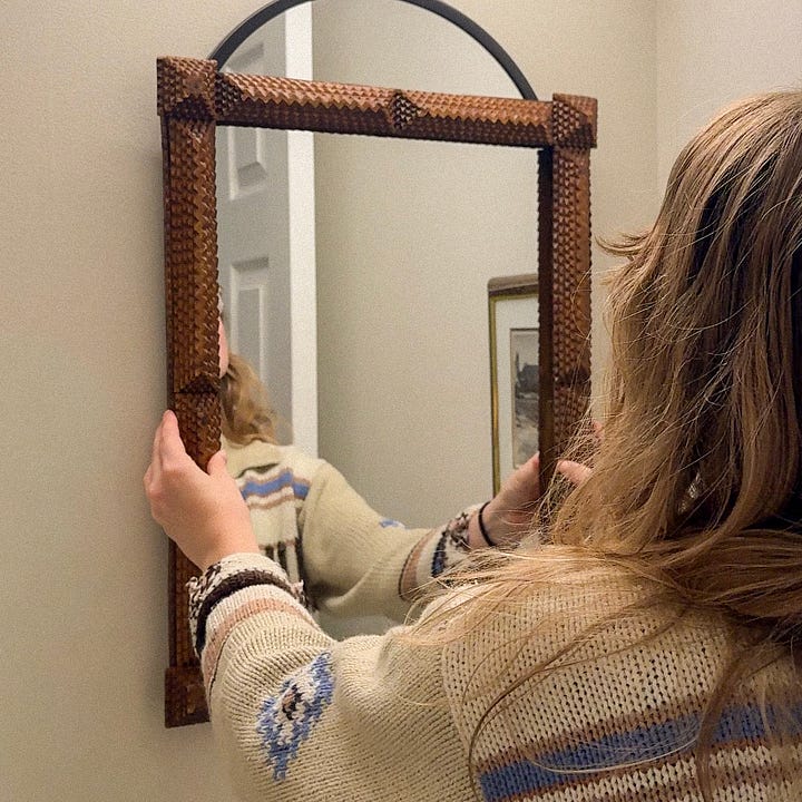 We rent, and honestly there’s nothing wrong with the space. It’s cute, but if it were my house, I’d add wallpaper or at least a bolder wall color. Since that’s not an option, a statement mirror felt like the perfect renter-friendly middle ground. It adds personality without commitment, and I can take it with me whenever we move.